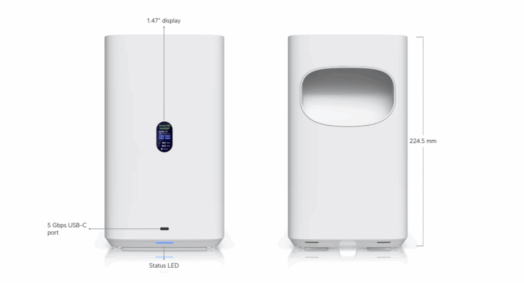 Ubiquiti UNAS-4 comes with four 3.5″/2.5″ HDD bays and two M.2 NVMe SSD cache slots, the UNAS-4 provides flexible configurations for high-capacity storage and accelerated caching performance. The 2.5 GbE RJ45 port ensures ultra-fast network throughput, while the 5 Gbps USB-C port supports quick data transfer or external device expansion.