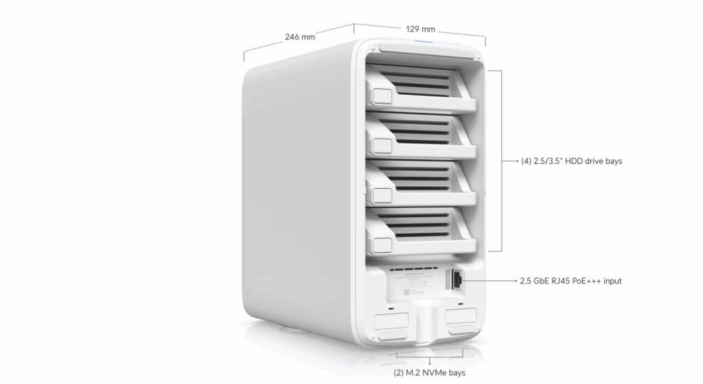 The Ubiquiti UNAS-4 is a next-generation Network Attached Storage (NAS) solution built for the UniFi ecosystem, featuring four 3.5″/2.5″ HDD bays, two M.2 NVMe SSD cache slots, and a 2.5 GbE interface for lightning-fast data performance. Powered by PoE+++ and managed through UniFi Drive, it combines enterprise-grade storage flexibility with compact, energy-efficient design — ideal for small offices, creative studios, and smart home data centers.
