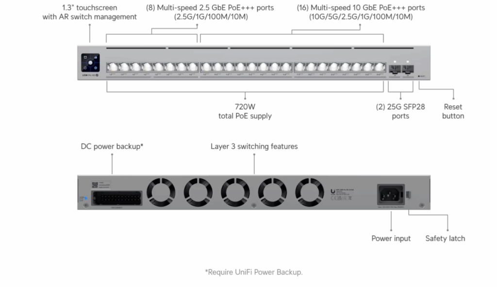 • High-Speed Connectivity: 24x PoE+++ ports — 16x 10G and 8x 2.5G RJ45 — plus 2x 25G SFP28 uplinks