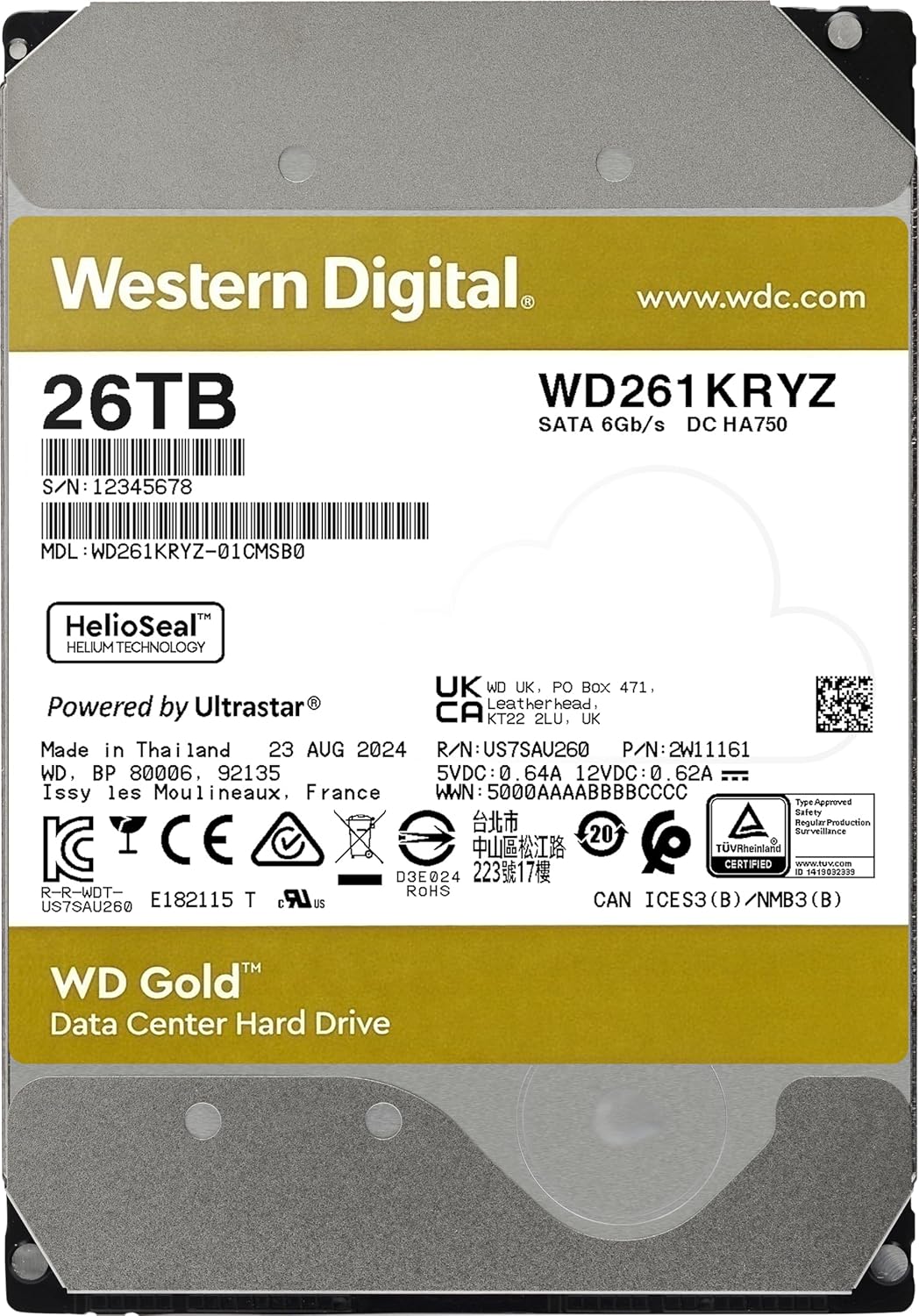The Western Digital WD Gold 26TB | WD261KRYZ 26TB Enterprise Class SATA HDD. This advanced 3.5-inch hard drive leverages the reliability and endurance required by mission-critical environments, making it the perfect choice for data centers, demanding commercial systems, and professional creative workflows. The WD Gold 26TB | WD261KRYZ is built with HelioSeal and OptiNAND technologies, providing massive 26TB capacity, exceptional durability, and robust power efficiency.